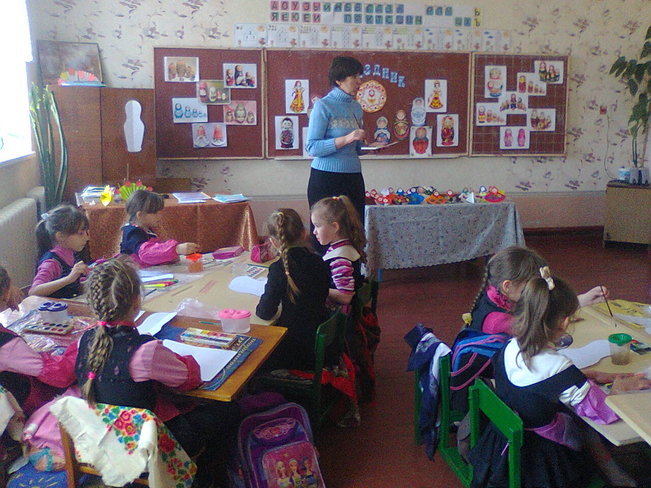 На уроке Трудового Обучения дети изготовили поделку «Матрёшка», и панно из ткани «Весёлая матрёшка». На уроке Изобразительного Искусства ребята научились раскрашивать матрёшку красками, используя разные техники рисования. На уроке Музыки девочки исполняли частушки матрёшек.